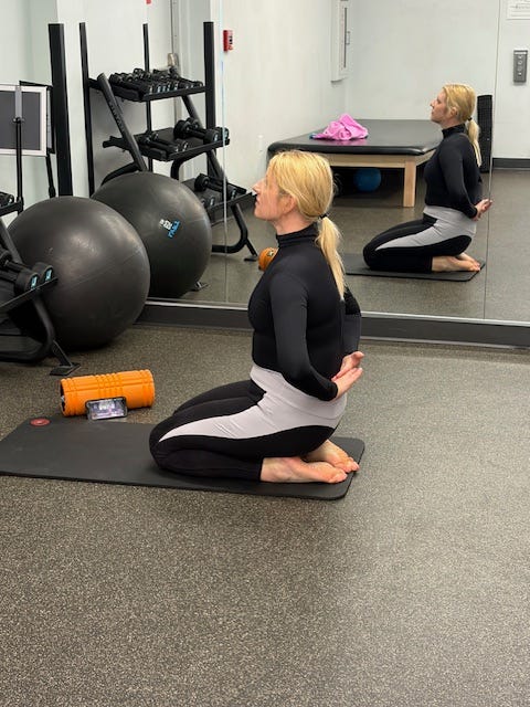Once a week, I did the hour-long videos on Friday afternoons at the gym, a pick-me-up just for me after a long week of lesson planning, grading, and stressed-out teenagers. In the little back stretching area of the gym, I planted myself on a mat in front of the wall of mirror in the little stretching area, popped in my earbuds, and fired up a livestream Full Body Mat workout on my phone, which I propped on the mirror.