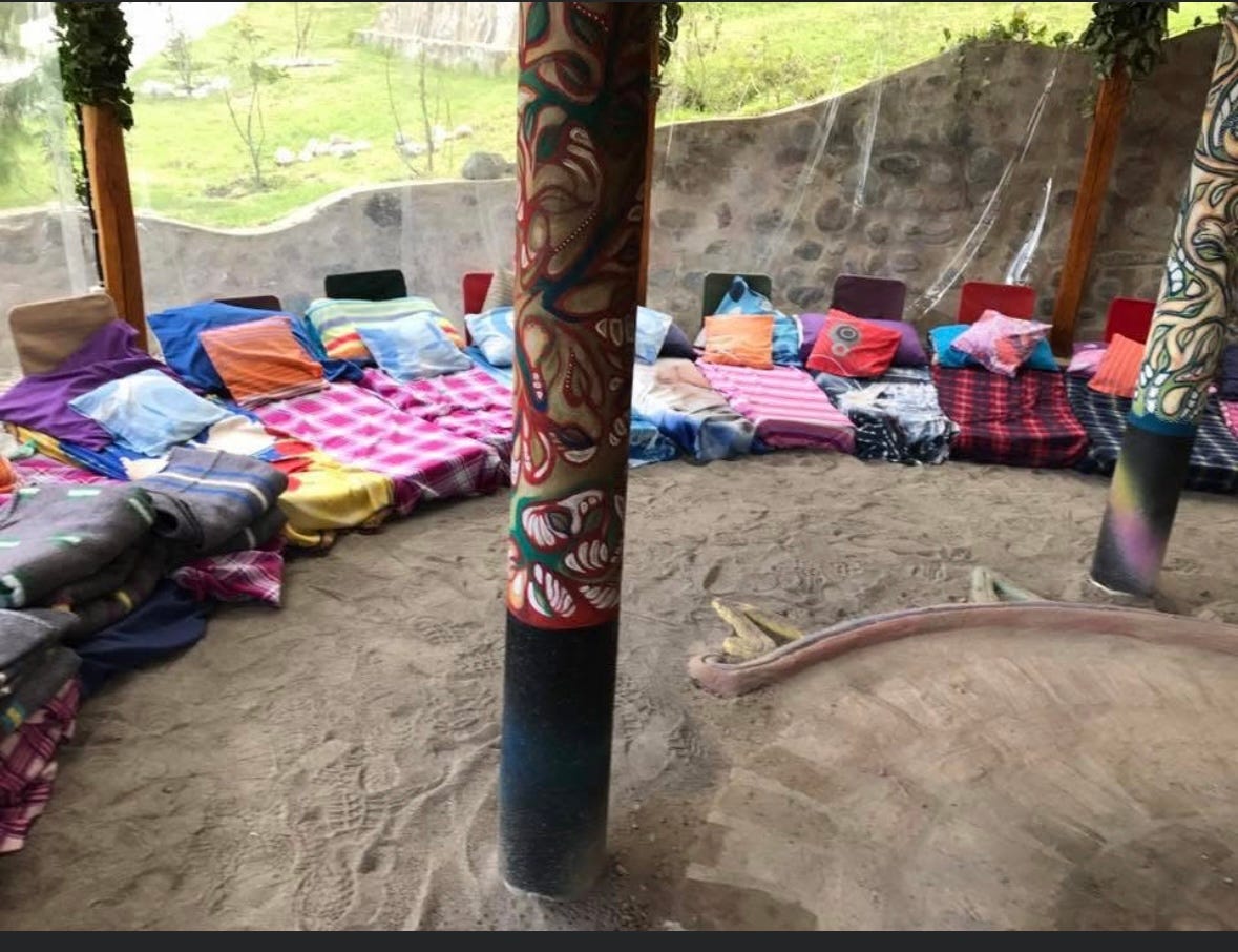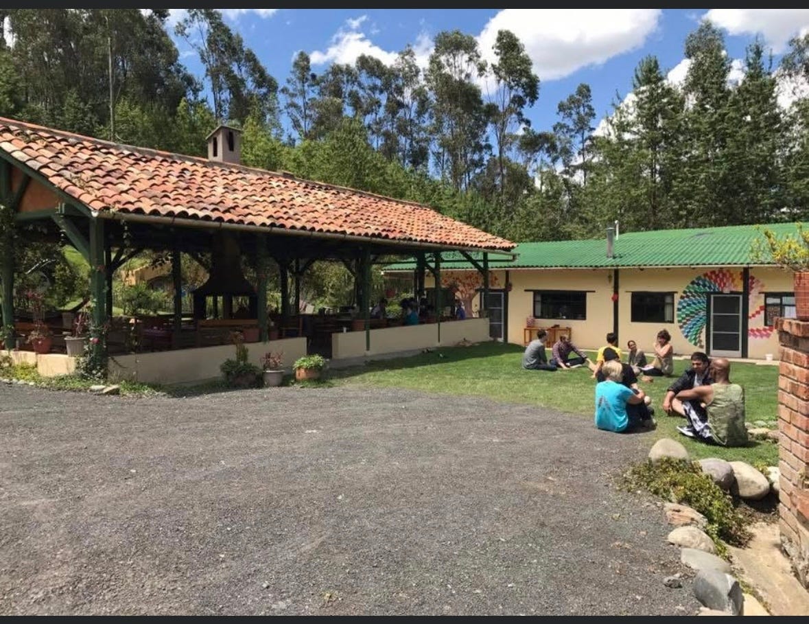 The retreat was stunning; verdant high green rolling hills, avocado trees, sharp chuquiragua flowers in bloom, blue jacardas, San Pedro cacti (another hallucinogen we would take). As I stepped off the bus, the thin air of Andes mountains embraced me, along with the staff and volunteers. This was a place of hugs. Huts with flowers and birds brightly painted on the walls were scattered around the property, alongside picnic tables under wooden pavilions, gazebos with long-haired men playing the guitar, open-aired kitchens, and shared bathrooms.