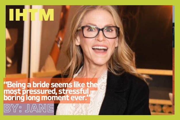 I credit my mom for the wonderful gift of growing up with absolutely no dreams of getting married and less than zero wedding fantasies. I have many times envisioned myself walking down the aisle - to accept the American Society of Magazine Editors award for General Excellence, which I never have been asked to do! But there’s still time! I have an actual dread/fear/maybe even phobia of ever walking down an aisle as a bride, though, with its specific attention/scrutiny/expectation to glow, for something I never understood to be an accomplishment. It sounds like the most pressured and phony and horrific and stressful and yet boring long moment I can imagine.
