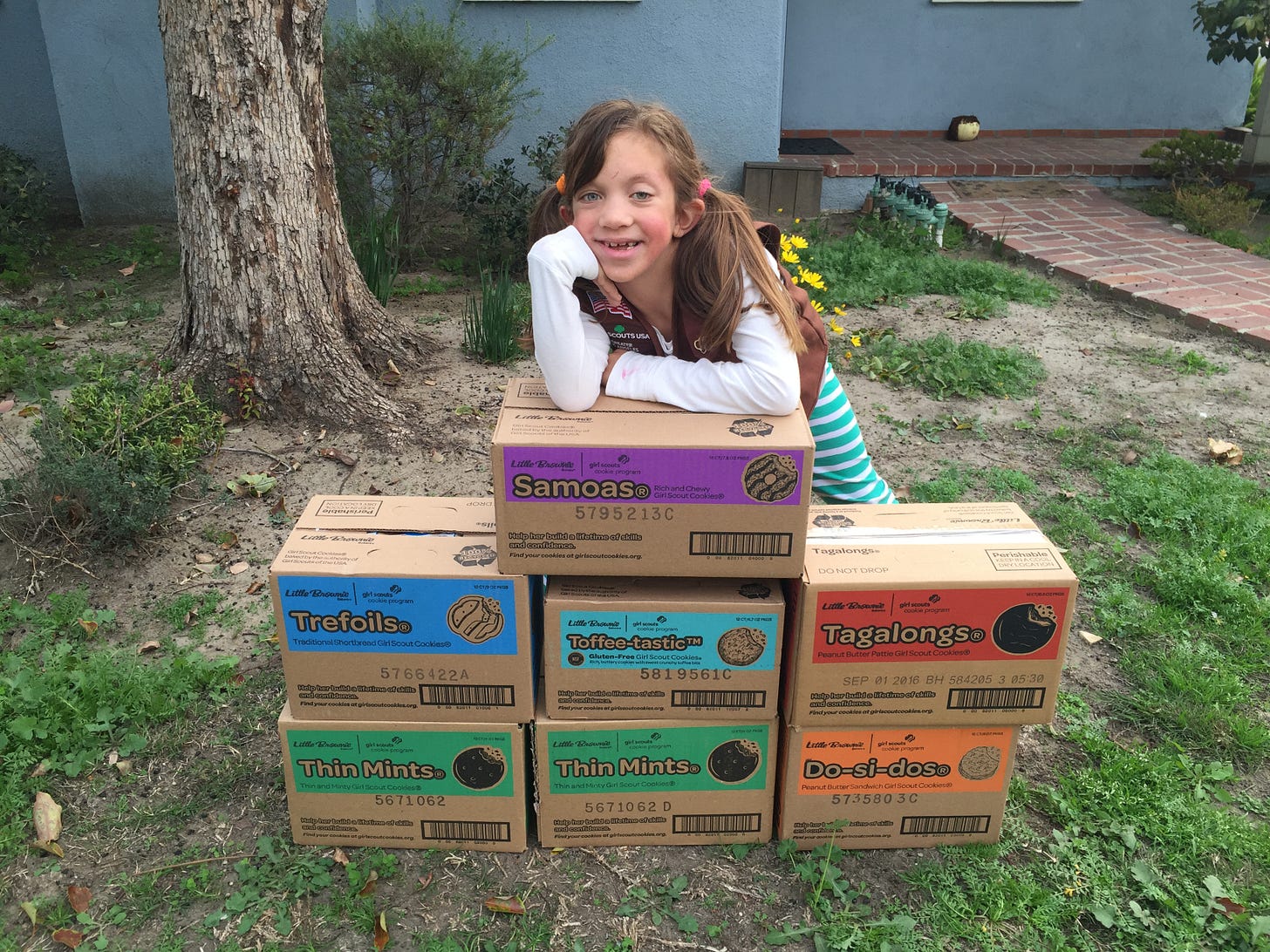 Late winter means one thing to me as a Girl Scout Troop leader for the last twelve years: Girl Scout Cookie sales. Every year we gather in front of grocery stores to sell cookies, the girls in vests adorned with badges and patches and stars and pins.